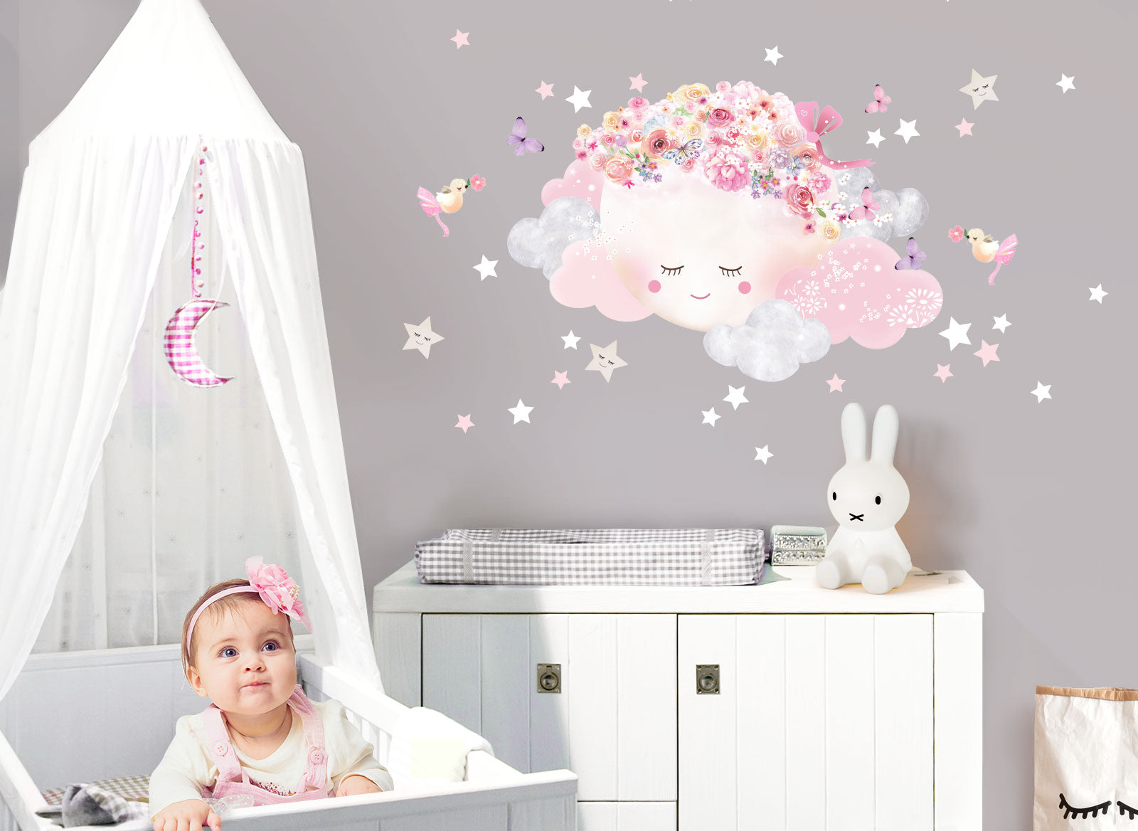 Wandtattoo Wolken & Mond mit Schleife Weiß / Rosa DK1080