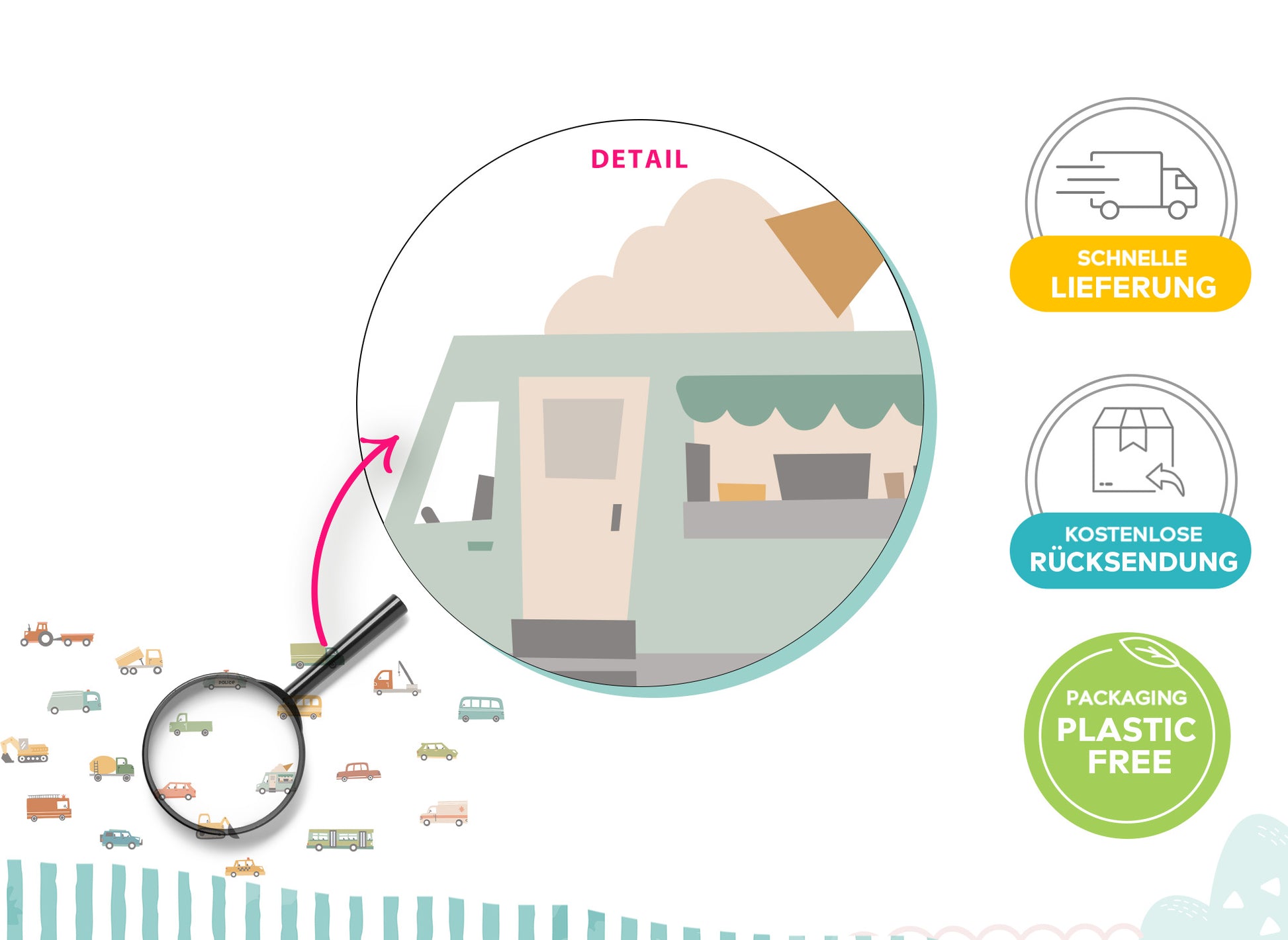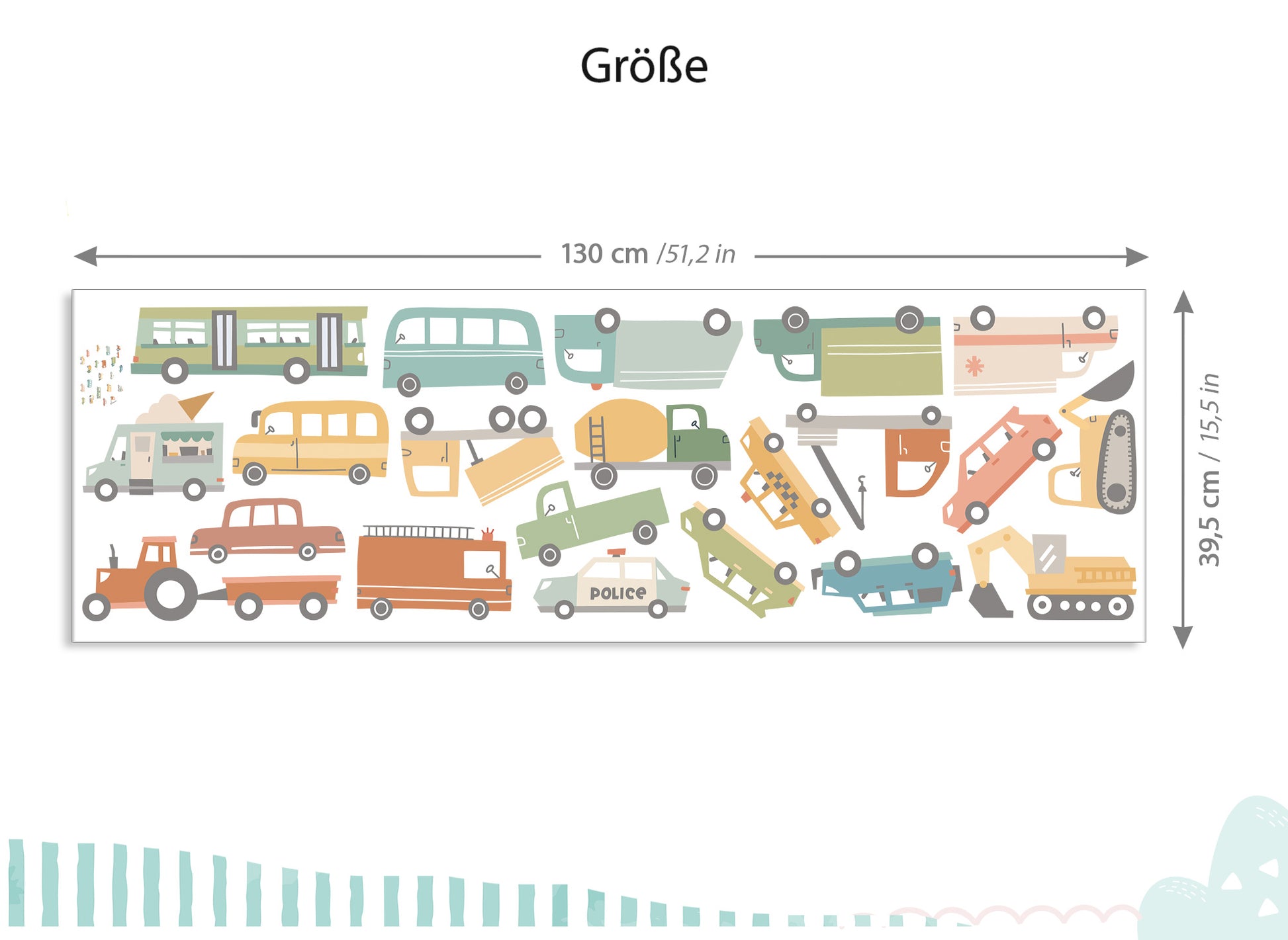 - 216 x 110 cm und der grüne Bus hat eine Größe von 29 x 9 cm