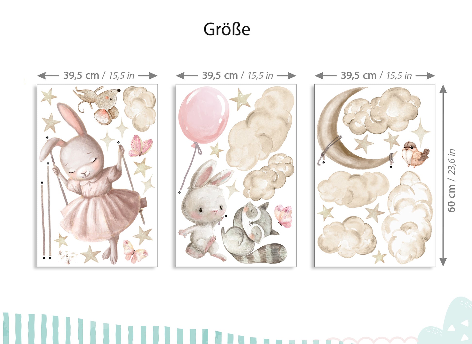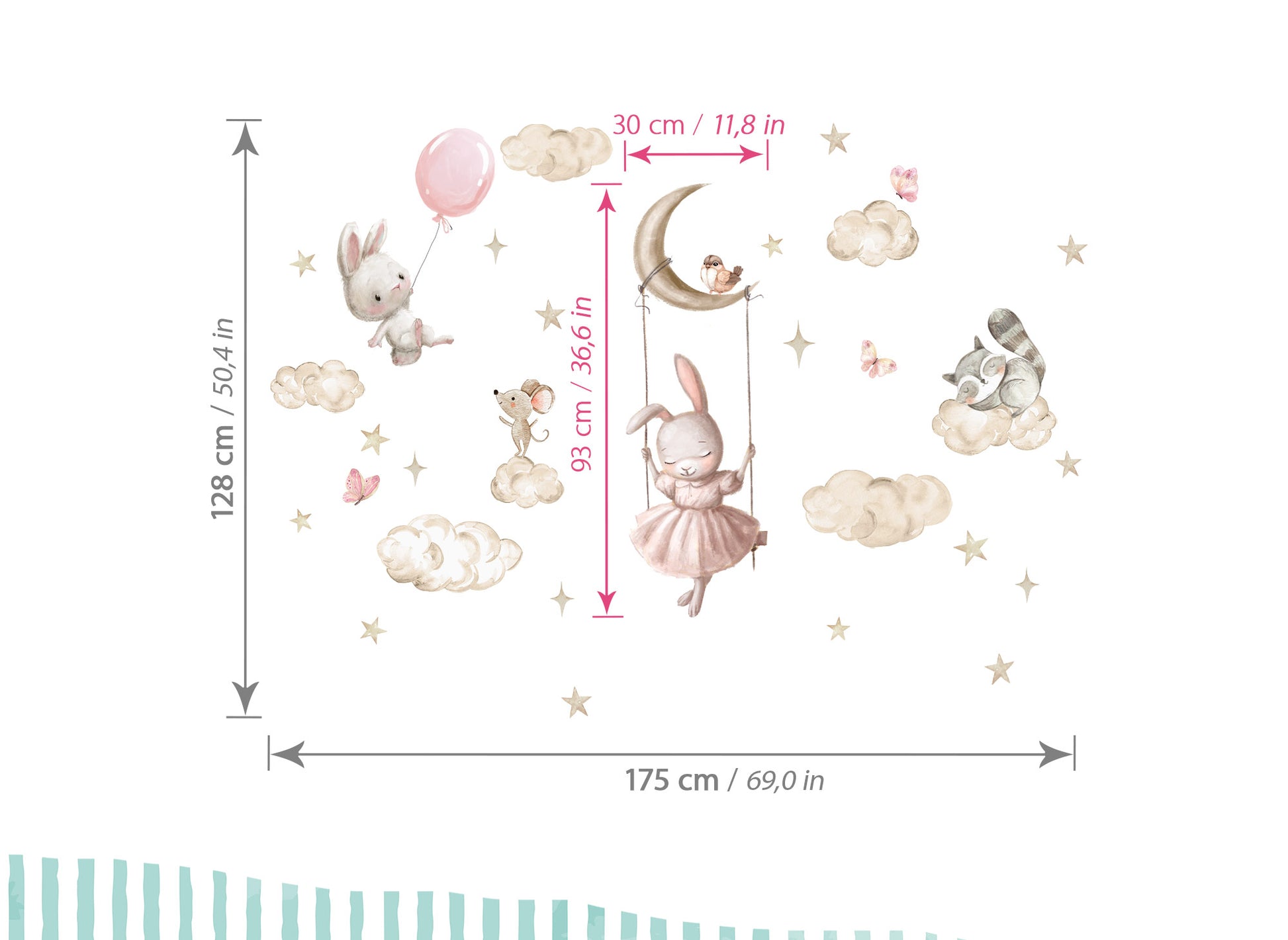 - 175 x 128 cm und der Hase mit Mond hat eine Größe von 30 x 93 cm