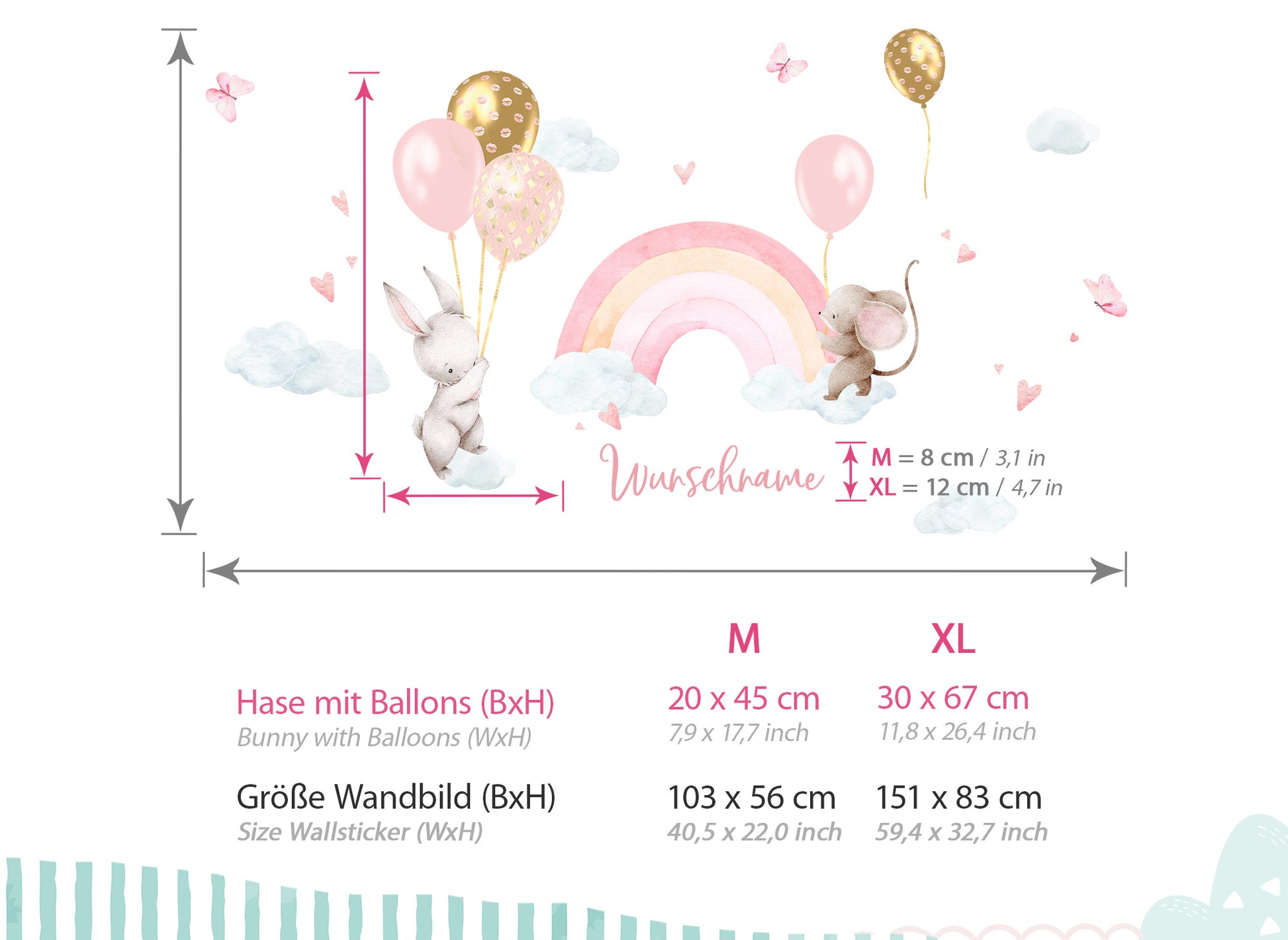 - M - 103 x 56 cm und der Hase mit Ballons hat eine Größe von 20 x 45 cm
