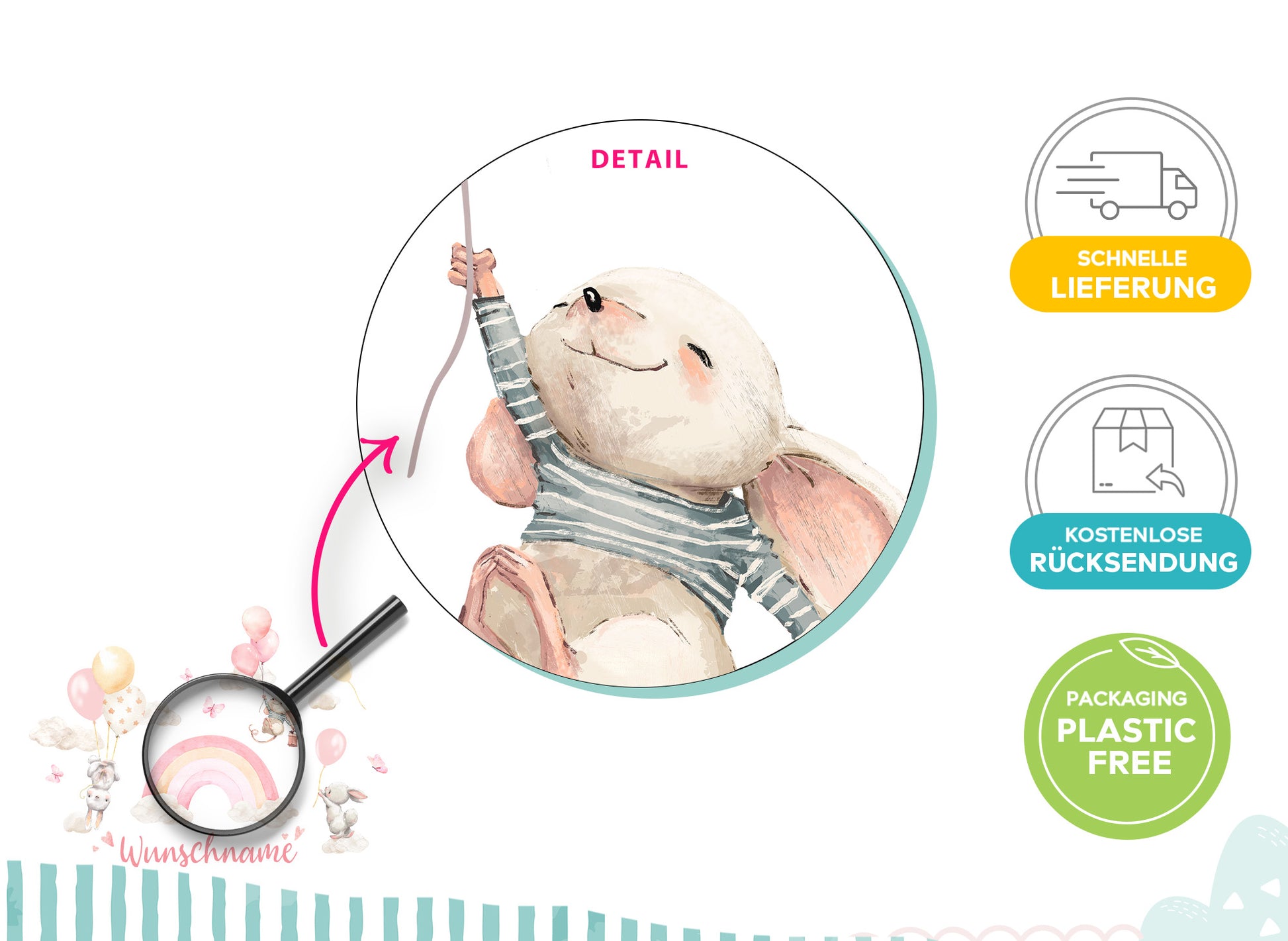 - L - 113 x 83 cm und der Hase mit Ballons hat eine Größe von 25 x 58 cm / Höhe des Wunschnamens 10 cm