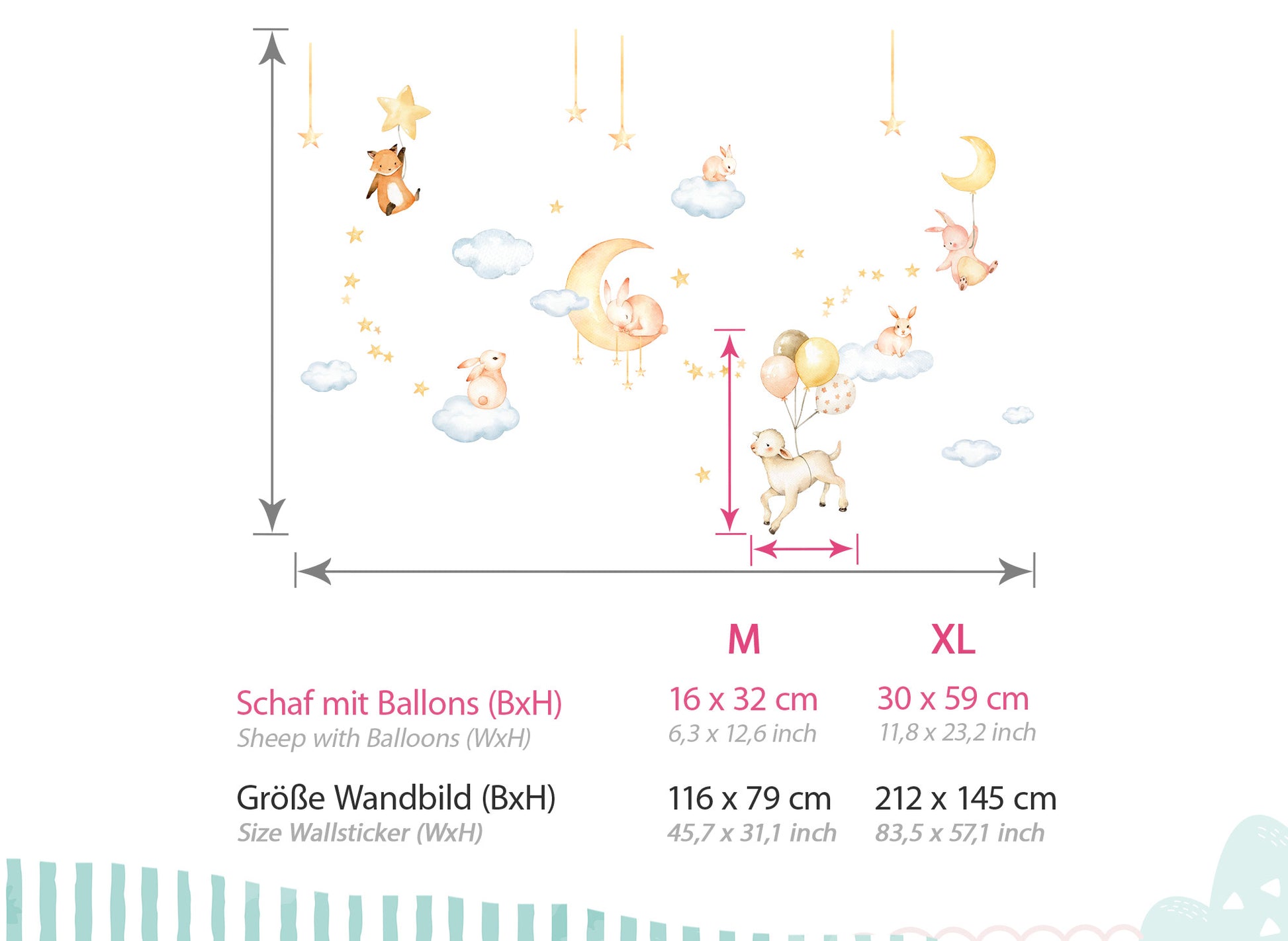 - XL - 212 x 145 cm und das Schaf mit Ballons hat eine Größe von 30 x 59 cm